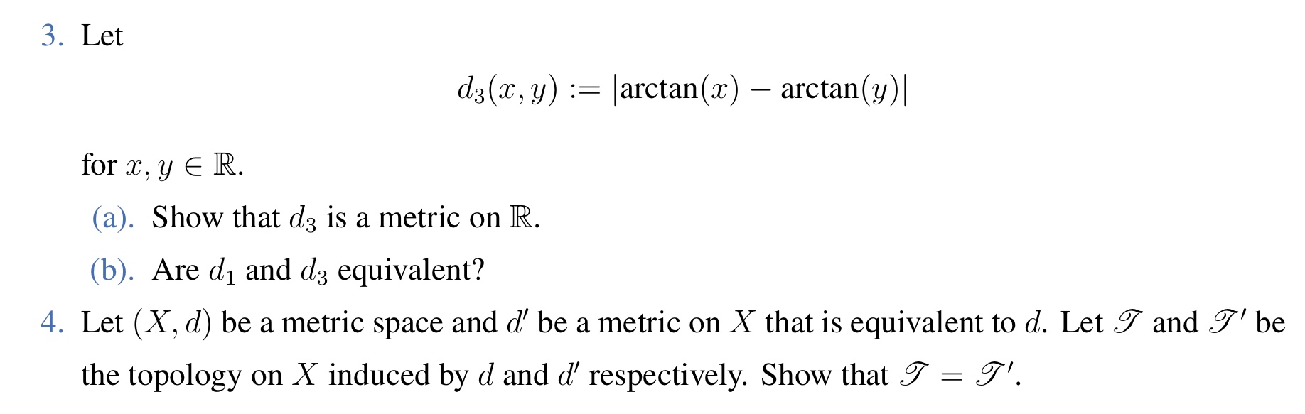 3. Let d3(x,y)=∣arctan(x)−arctan(y)∣ for x,y∈R. (a).