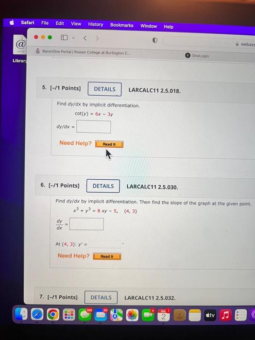Solved Find dy/dx by implicit differentiation. cot(y)=6x−3y