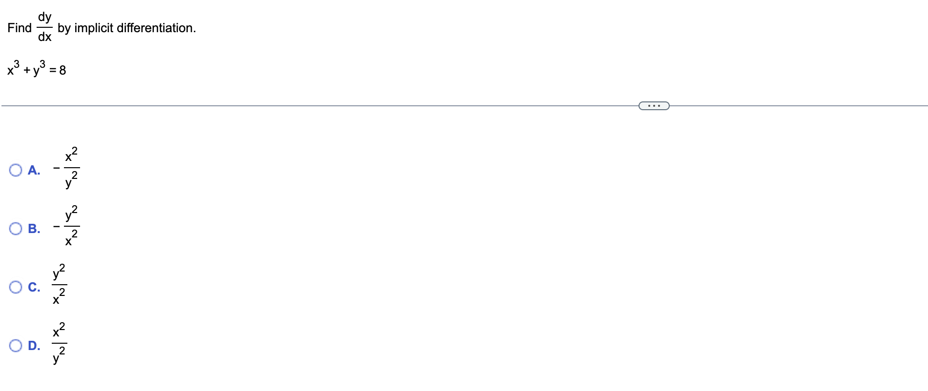Solved Find dxdy by implicit differentiation. x3+y3=8 A.