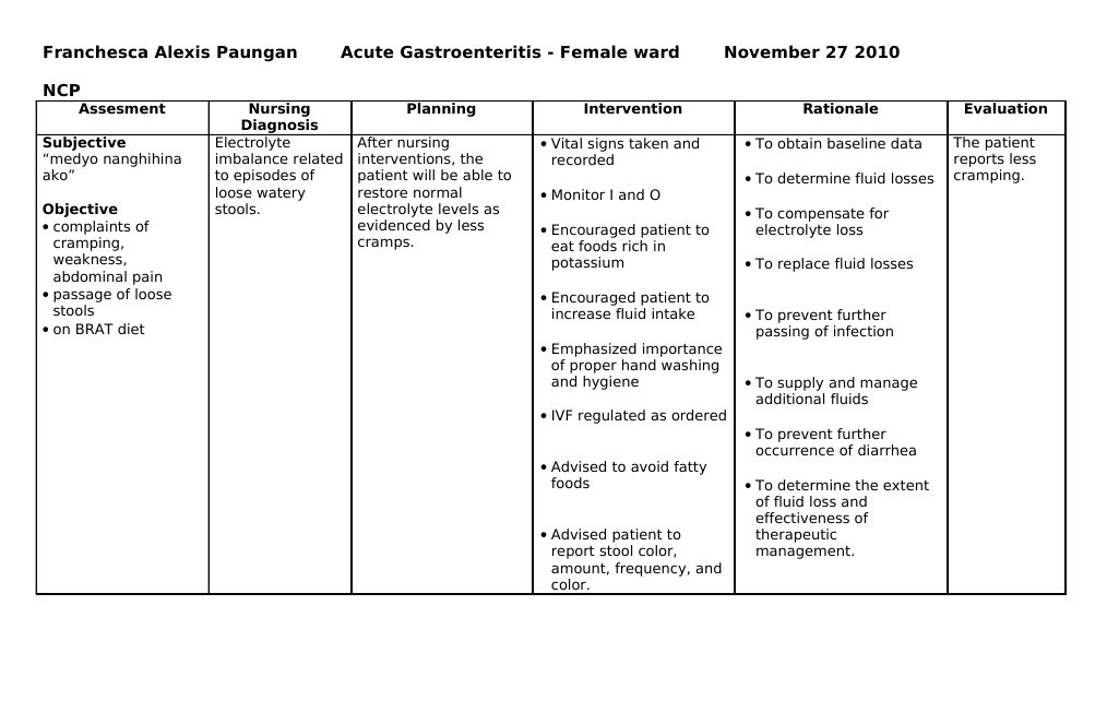 Gastroenteritis is an inflammation of the stomach, small intestine, and large intestine. Fluid volume deficit related to excessive fluid loss through vomiting and diarrhea. A nursing care plan should be developed to ensure proper.