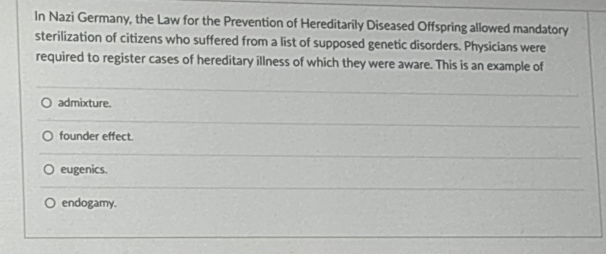 SOLVED In Nazi Germany, the Law for the Prevention of Hereditarily