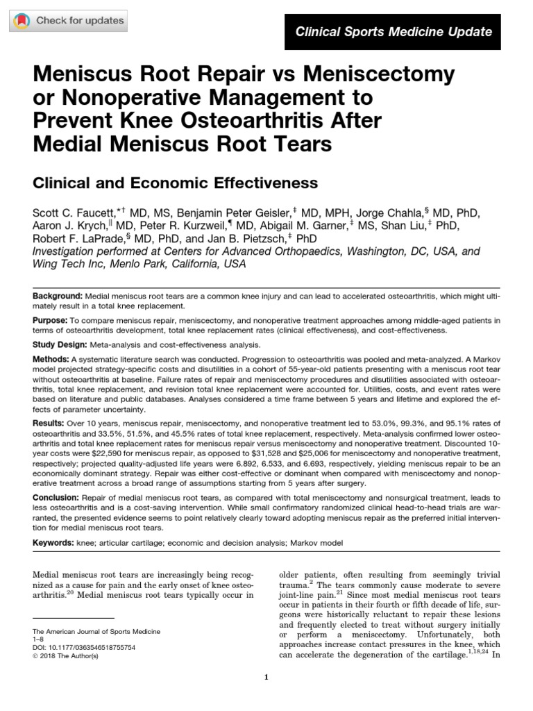 Meniscus Root Repair Vs Meniscectomy or PDF Osteoarthritis Knee