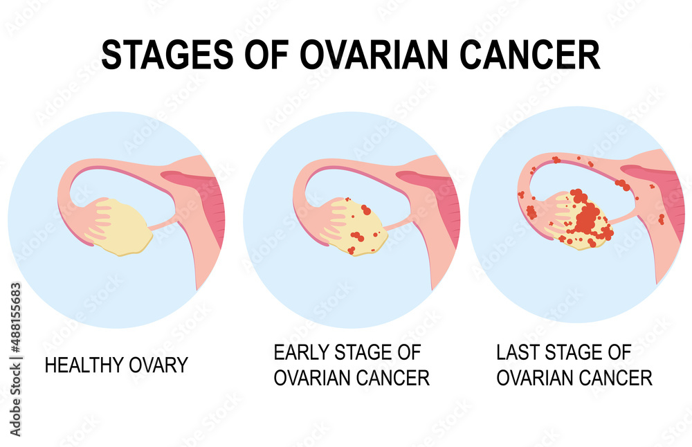Diagram showing stages of ovarian cancer illustration. Pelvic cancer