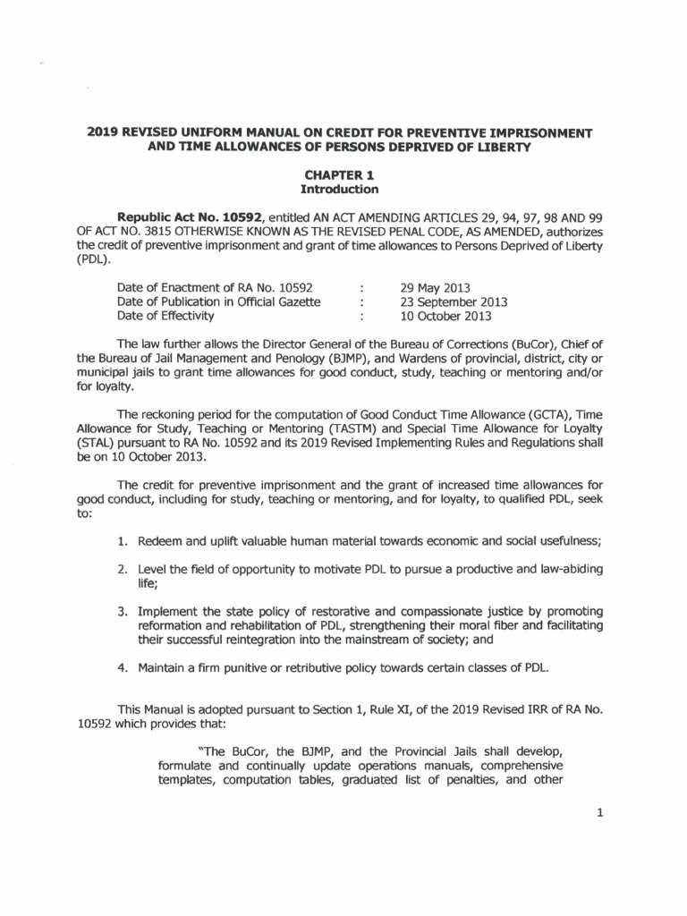 2019 Revised Uniform Manual On Credit For Preventive Imprisonment and
