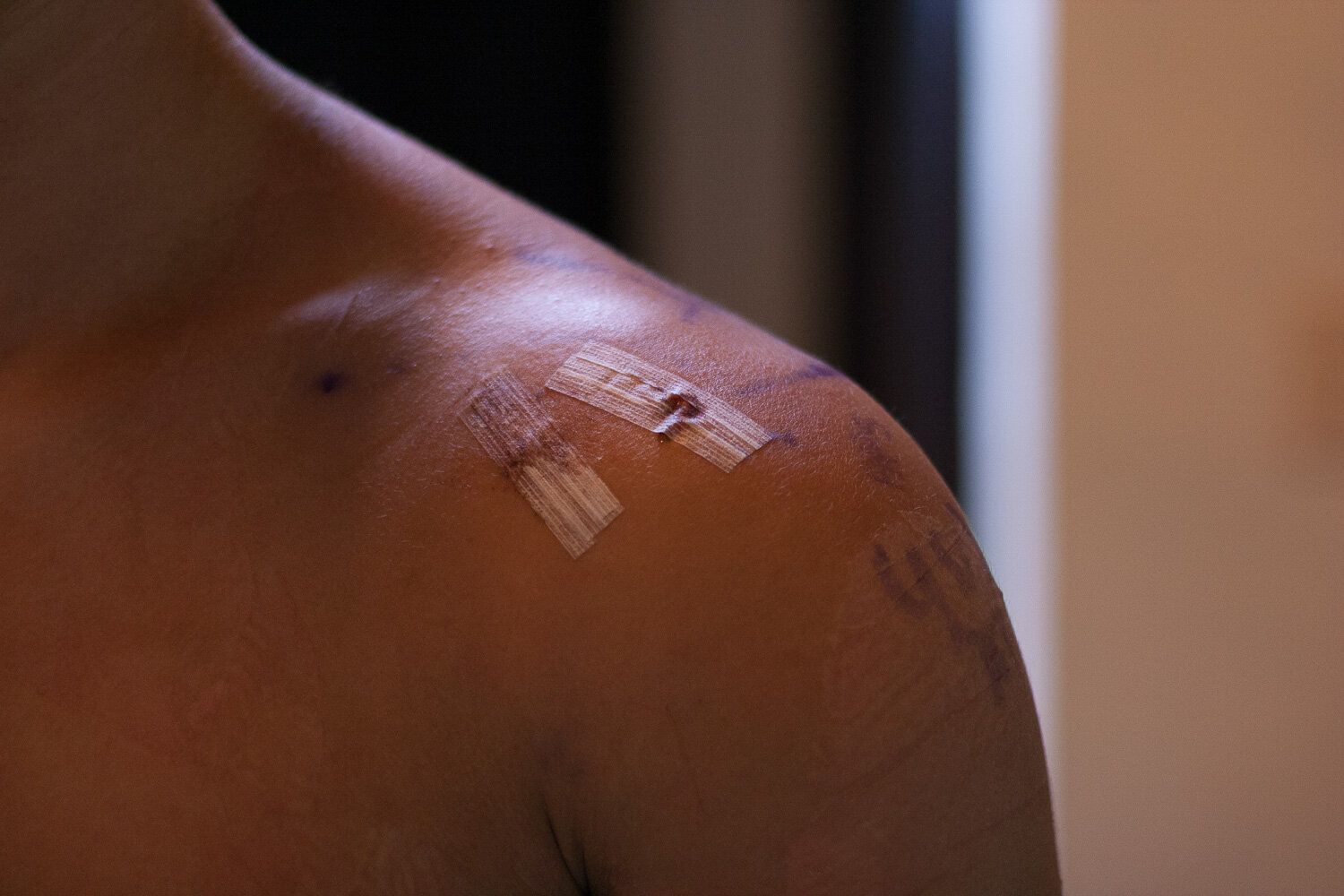 Male shoulder with scars after shoulder arthroscopy surgery. Chronic