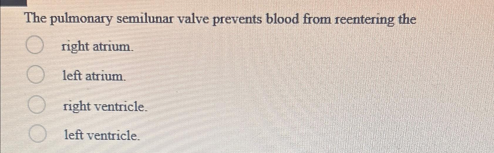 As blood leaves the right ventricle it passes through the ________ and then into the pulmonary trunk. The pulmonary valve prevents blood from going backward from the pulmonary artery to the right ventricle. The ________ valve prevents backward flow into the left atrium. The pulmonary semilunar valve prevents backward flow into the. The pulmonary semilunar valve prevents.