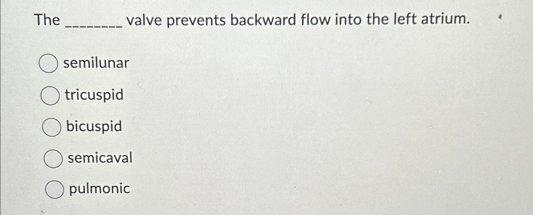 Study with quizlet and memorize flashcards containing terms like the _____ valve prevents backward flow into the left atrium. The pulmonary semilunar valve prevents backward flow into the. The pulmonary semilunar valve prevents. The pulmonary valve prevents blood from going backward from the pulmonary artery to the right ventricle. The ________ valve prevents backward flow into the left atrium.