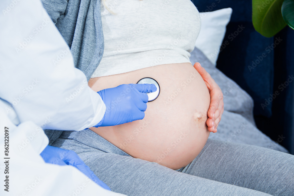 Closeup of big pregnant female belly, tummy. Doctor is listening sounds